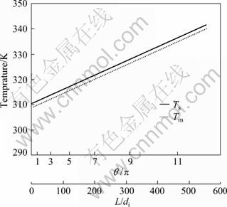 With constant heat flux boundary condition, mean fluid temperature in the spiral coiled tube and mean surface temperature are presented along downstream direction in Fig. 7.