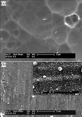 Fig.1 SEM photographs of surfaces of chemically-polished NiTi SMA (a) and NiTi SMA after Fenton’s oxidation treatment (b)