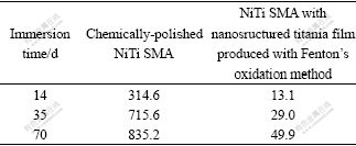 Table 1 Concentrations of Ni ions detected in SBF by ICPMS for chemically-polished NiTi SMA (a) and NiTi SMA with nanostructured titania film produced by Fenton’s oxidation method after different immersion time (b) (10-6)