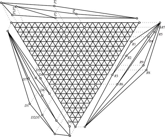 This triadic lattice structure is regarded as a symmetric structure where the set of objects, attributes and conditions are all treated equally [59]. Generally this structure is drawn as a triangular graph. For a better understanding, we can draw complete lattices for extents, intents and modi each. Since these are drawn along the sides of triangular graph, they are called as side lattices [29]. Recently, three-way analysis of FCA is new concept under investigation [60].