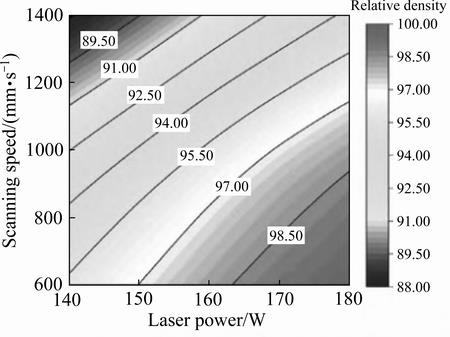 邹亚桐等[24]利用田口方法研究激光功率、扫描速度、扫描间距等工艺参数对激光选区熔化AlSi10Mg合金致密度的影响,当激光功率较低时,粉末容易产生球化效应,导致铺粉不均匀。张骁丽等[23]也提出球化严重将造成下一层表面更加粗糙,产生“连锁效应”,甚至终止成形;通过适当提高激光功率可以减少孔隙,最终确定的激光功率为160~180 W。扫描速度不宜过低或者过高,过低会引起部分蒸发气体残留在内部形成气孔,过高则导致粉末熔化不完全,极易产生大量孔隙,优化后的扫描速度为800~1100 mm/s,并且扫描间距为0.05 mm时成形效果最好。当然,获得高致密度零件的充分条件还包括足够的能量密度输入,但能量密度过高会引起过烧,一般在4.0~6.0 J/mm2之间合适。柯宇等[37]通过激光选区熔化制备的AlSi10Mg合金的平均致密度达到99.6%,并且分析了影响合金致密度的主要因素包括粉末碰撞飞溅、冷却速度快和氧化杂质;另外,作者还给出了工艺参数与致密度的优化云图,如图4所示,该结果为提高激光选区熔化铝合金及铝基复合材料的致密度提供了重要参考。