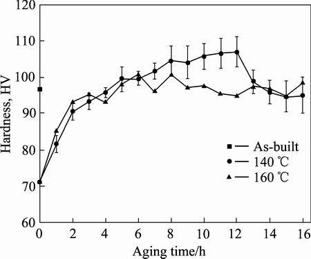Fig. 5 Hardness curves of selective laser melted AlSi10Mgalloy aged at 140 ℃ and 160 ℃[61]