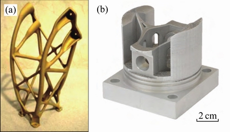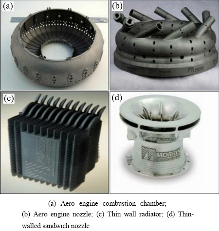 激光选区熔化技术具有表面质量好、制造精度高等特点,能够实现悬空、型面和复杂内腔的整体制造,是满足航天航空制造领域中复杂薄壁精密构件高性能的理想制造方法。在应用方面,美国通用电气公司率先成立激光选区熔化金属材料研发团队,并在2012年收购了Morris和RQM公司。图6为GE/Morris公司利用激光选区熔化技术制造的复杂结构金属零件[71]。