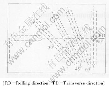Tensile test specimens were machined from the annealed aluminum alloy sheet at 0°, 30°, 45°, 60°, 90° with respect to the rolling direction in the rolling plane. Fig.1 shows the tensile specimens of different orientation in the rolling plane. The size of tensile specimens and the tensile test were accorded to GB6397—86 and GB228—87, respectively. Specimens were tested on CSS-44100 tensile testing machine and the ratio was 2mm/min.