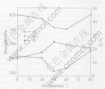 Table 2 and Fig.2 show the variations in tensile mechanical properties as a function of specimen orientation with respect to the rolling direction. It can be seen that, the yield strength varies with the specimen orientation, reaching the minimum at 45° to the rolling direction. The elongation also varies with the specimen orientation, reaching the maximum of 25.3%. The in-plane anisotropy of σ0.2 and δ5 is higher than that of σb.