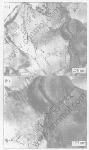 The TEM micrographs of 1545 alloy sheet are shown in Fig.5. A number of subgrains exist in the annealed sheet, which shows that recrystallization does not happen in the alloy (Fig.5(a)). Under high magnification, it can be seen that nanometer Al3(Sc, Zr) particles precipitate. These particles strongly pin the dislocations and subgrain boundaries, and inhibit the recrystallization (Fig.5(b)).