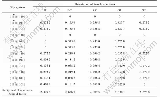 Table 5 Schmid factors of slip system {111}〈110〉 for various tensile orientations and reciprocal of maximum Schmid factor of every orientation