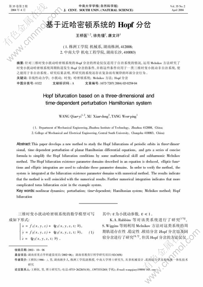 关键词:非线性动力学;小扰动;时变;哈密顿系统; Melnikov方法; Hopf分岔