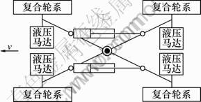 复合轮式海底行走机构(见图1)包括4套复合轮系机构,相当于传统的4×4车辆。每套复合轮系采用独立液压马达进行驱动,被动行驶时相当于12×12轮驱动,接地比压较大,既可在坚硬的底质上行驶,又可在稀泥底质上行驶。采用铰接式车架,运动灵活,同时提高越障和避障的稳定性。