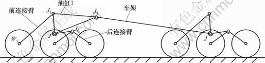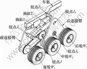复合轮系机构(见图2)中的3个车轮W1,W2和W3在油缸1和油缸2的伸缩作用下可实现一定程度的空间位置变化,从而完成深海复杂多变底质下的越障行驶。