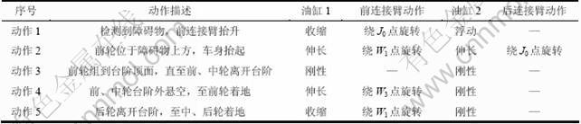 垂直越障高度是体现海底行走机构越障性能的一个重要指标[12]。为了对深海复合轮式行走机构的轮组机构(见图3)进行结构优化,首先对主动垂直越障时轮组机构的受力进行分析,将垂直越障分解为5种动作(见表1)。