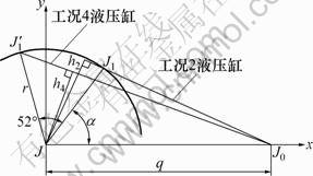 两个工况中油缸作用力与机构的反作用力之间的力臂,即h2和h4的长度,与油缸的伸长缩短有关,还与油缸铰接点相对于J点的位置有关。