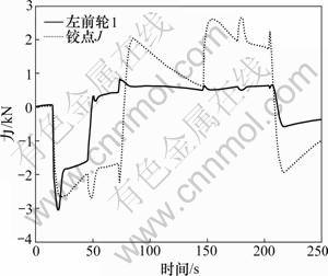 由图9可知:左前轮1开始跨越台阶时,阻力剧增,上台阶面后阻力迅速减小;而铰点J处越障时X方向的受力大小几乎相同,方向相反;由此可知:左前轮1开始跨越台阶时,受力出现峰值,后轮越障时因质量转移,左前轮1在Y方向的受力减小(见图10);而铰点J处的受力变化很小,并且各轮胎越障瞬间的波动也比较小;左前轮1越障时,左前轮1受力的峰值约为5 250 N,铰点J处受力峰值约为3 700 N,铰点J处受力峰值要远小于左前轮1处的受力峰值,见图11。复合轮式海底行走机构具有较强的越障能力,并越障时可保持车体相对平稳。
