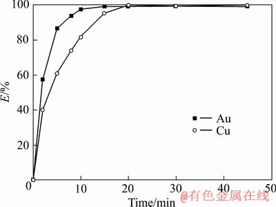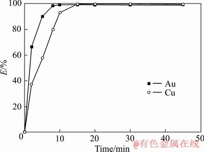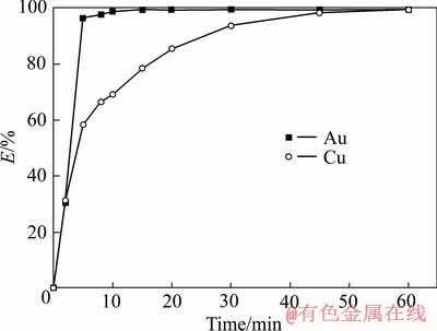 Fig. 2 Change in percent extraction of gold and copper with reaction time during organic phase loaded with certain amount of Cu(Ⅱ) passing through extraction column only once