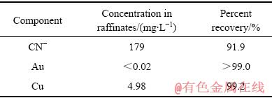 氰化提金废水经鼓泡油膜萃取后,萃余液中残留的金、铜及游离氰根浓度见表2。