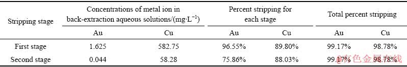 2) 萃取饱和后的有机相经过酸性硫脲反萃,金的总反萃率高达99.17%,铜的总反萃率为98.78%。反萃后有机相可以循环使用。