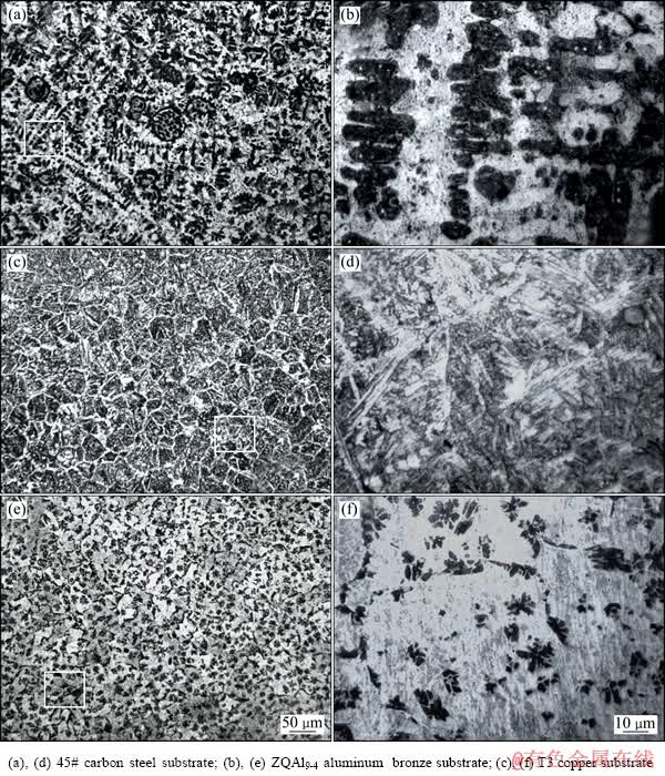 图2所示为3种基体的合金喷焊层金相组织。其中:2(b)、(d)和(f)所示分别是2(a)、(c)和(e)中白色方框内放大后的组织。由图2可看出,45#钢、ZQAl9-4铝青铜和T3紫铜基体的喷焊层组织结构明显不同,45#钢基体的喷焊层黑色相呈细小点状、树枝状和球形,白色相与灰色相围绕着黑色相生长,黑色点状相较多,组织细小(图2(a)和(b));ZQAl9-4铝青铜基体的喷焊层灰色相呈针状(图2(c)和(d)),层片状的白色相呈网状分布在灰色相晶界上,而黑色相呈点状不均匀分布;与前两类基体上喷焊层组织相比,T3铜基体的喷焊层黑色相呈枝状和梅花状(图2(e)和(f)),分布均匀,粒状白色相和灰色相包围其生长,组织均匀细小。
