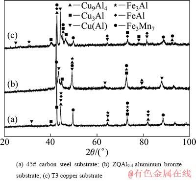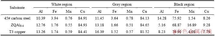 表2所列为3种基体的高铝青铜喷焊层微区元素含量测量结果。结合图3合金喷焊层的XRD谱和 MDI jade 5.0软件定量分析可知,喷焊层中黑色组织为K相,属富Fe和Al组织,灰色组织为β′相,白色组织为α相并伴有少量γ2相,为富Cu组织。喷焊层中主量相为α相,45#钢基体的喷焊层中K相主要是K1(Fe3Al)和K2(FeAl)相;ZQAl9-4基体的喷焊层中K相主要由Fe3Mn7和K1(Fe3Al)相组成;T3铜基体的喷焊层中K相以K2(FeAl)相为主。