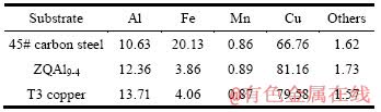 表3所列为高铝青铜喷焊层元素的EDS面扫描结果。由表3可知,喷焊后45#钢基体的喷焊层中Fe元素含量为20.13%(质量分数),较原合金中2%~4%高,Al元素含量为10.63%(质量分数);ZQAl9-4铝青铜基体的喷焊层中Al元素含量为12.36%(质量分数),较原合金中的低,而Fe元素含量与原合金中的接近;T3紫铜基体的喷焊层中Fe和Al元素含量与原合金中Fe和Al元素含量相近。