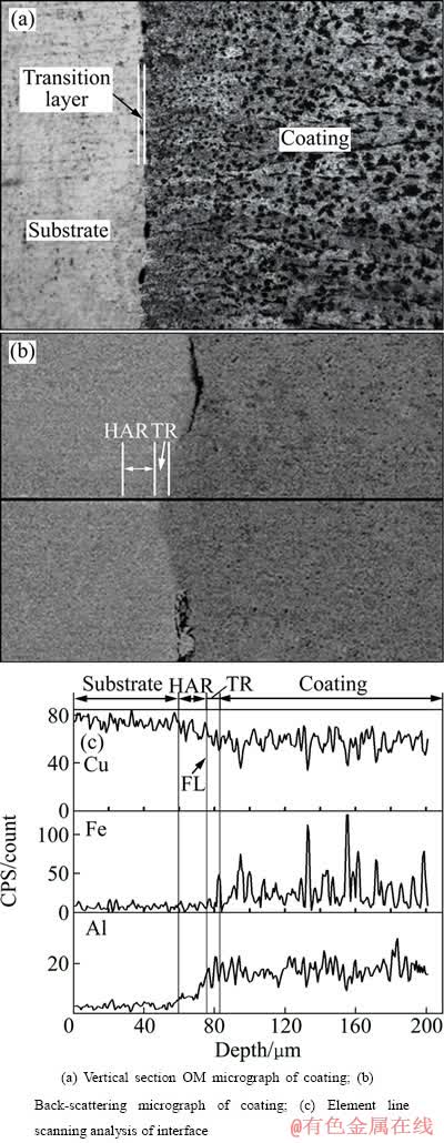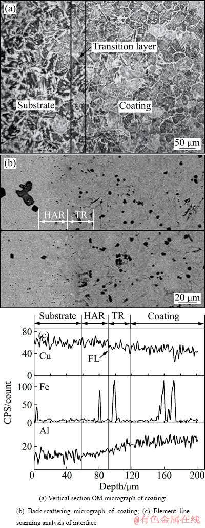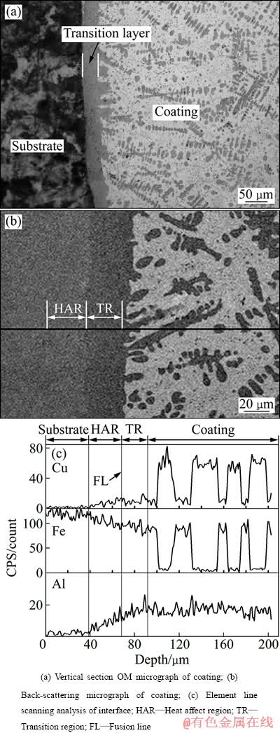 Fig. 6 Vertical section OM micrograph and interface element line scanning analysis of coating fabricated on ZQAl9-4 Al bronze substrate