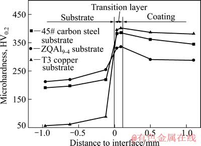 表4所列为3种基体上喷焊层的宏观硬度及其界面结合强度。图8所示为沿喷焊层纵深方向的显微硬度。由表4和图8可知,T3紫铜、45#钢、ZQAl9-4铝青铜基体的喷焊层表面宏观硬度及其纵断面显微硬度依次减小。T3紫铜、45#钢、ZQAl9-4铝青铜基体与喷焊层间的结合强度依次增大。