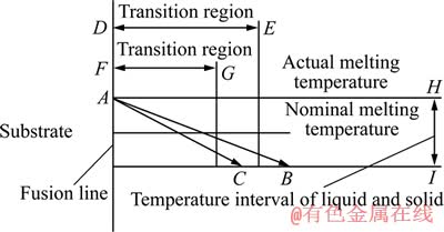 喷焊时,在等离子弧作用下,合金粉末熔化的同时,基体金属表层也发生熔化,而共同形成了熔池。在等离子弧强烈搅拌作用下,熔池中合金元素与基体之间发生了充分的互溶扩散,从而有大量元素从界面处扩散,最后在界面处形成了过渡层,而过渡层宽度受基体金属的液固温度区间和温度梯度的陡缓趋势影响[23]:温度梯度一定时(AB或AC),金属基体液固温度区间(HI)越大,过渡层越宽;金属基体液固温度区间(HI)一定时,温度梯度陡降趋势越大(AB→AC),过渡层越窄(图9)。由于T3紫铜、45#钢、ZQAl9-4铝青铜的液固温度区间(HI)依次增大[19],加之T3紫铜导热快,温度梯度陡降大(AB→AC),形成的过渡层宽度增加,分别如图5(b)、6(b)和7(b)所示。另外,受基体快速激冷及热传导作用的影响,喷焊层底层熔化合金形成了逆热流传导方向生长的致密枝晶组织,但枝晶生长不是由热流唯一决定的,同时还受结晶各向异性的影响,底层枝晶组织在界面边缘处形核后外延生长,生长方向与固液界面法向呈一定角度,如图5(a)、6(a)和7(a)所示。
