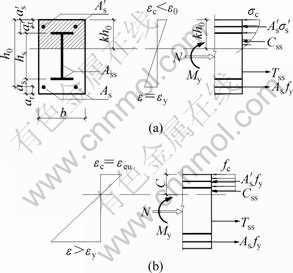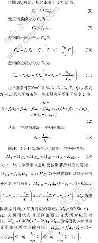 型钢混凝土柱压区混凝土达到极限压应变(即极限状态)时截面的应力应变分布图如图3(b)所示。