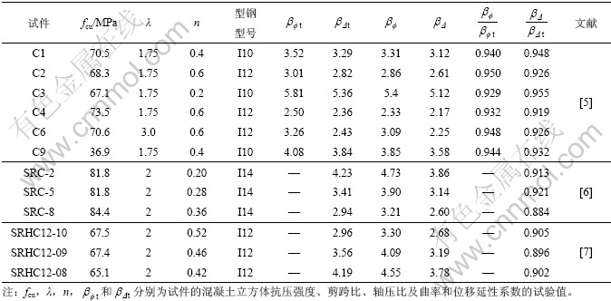 为验证本文推导的有关结论,将有关文献[5-7]中试件的特征值代入本文所得的相应公式中,计算得到构件的曲率和位移延性系数如表1所示。图5所示为本文计算所得实腹式型钢混凝土柱延性系数β与试验结果的对比情况。