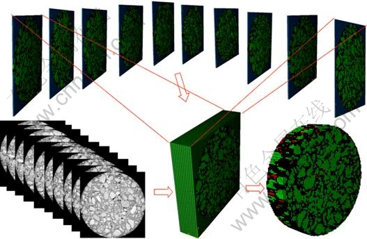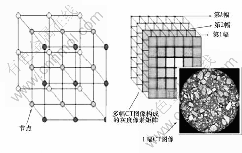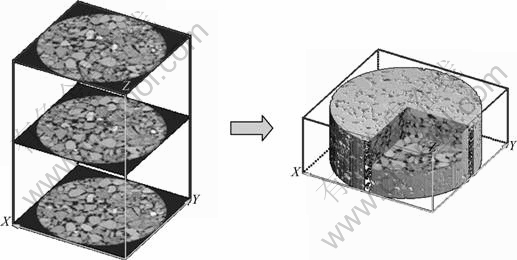 利用CT扫描混合料试件后可以得到N幅一系列连续CT图像,如图2所示。对图像进行叠加,利用图像处理软件如VGStudio,IDL和Image Pro Plus等软件实现试样的三维可视化重构,如图3所示。必须指出的是三维可视化模型不能用来进行力学数值模拟,开发基于CT扫描的三维图像技术来获取沥青混合料试件的内部结构,除了用于分析试样的内部体积组成,更重要的是为进行力学数值模拟,即虚拟力学试验,这就需要将三维可视化试样转换成三维数值试样。由于没有专用于沥青混合料的图像处理软件,并且处理过程相对复杂,实际上现有工业CT所附带的图像处理软件主要用于工业生产领域,如工业产品缺陷检查等。本文重点研究考虑空间真实细观结构的沥青混合料三维数值模型的重构算法,根据提出的算法开发沥青混合料试样三维重构程序,建立反映空间实际分布形态的沥青混合料三维数值模型,为虚拟力学试验奠定基础。