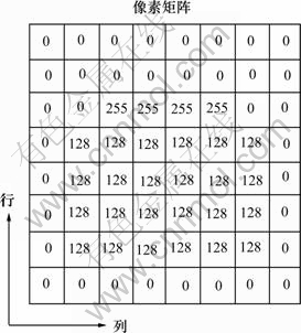 CT图像数量可以通过参数设定控制,理论上,只要获得的CT图像数量越多,相邻间距越小,越接近真实混合料试样。例如,对于一个标准马歇尔试件,其标准高度为63.5 mm,若获得1 001幅CT图像,则相邻2幅CT图像之间的间距为0.063 5 mm,这样小的图像间距对于建立的三维结构误差可以忽略不计。CT图像可以转换成256级的灰度图像,即8位黑白图像。对于每幅CT图像的灰度像素矩阵,假设其矩阵大小为mn,即像素个数为mn,因此1个像素可以代表1个长方体单元,每个长方体单元具有8个节点,多幅连续CT图像转换成的灰度像素矩阵,叠加形成的灰度单元体网格,如图4所示。取其中任意一幅CT图像的灰度像素矩阵,如图5所示,其1个像素由1个字节描述。0表示黑色,255为白色。从图5的像素矩阵示意图可见:每1个像素点是1个微小的正方形区域,可以用来表征材料的二维平面网格。根据上述原理和重构思想,可以得出结论:实现重建的关键技术是求出每个节点的三维空间坐标(i, j, k),以及每个单元体与自身相邻8个节点的匹配逻辑关系。