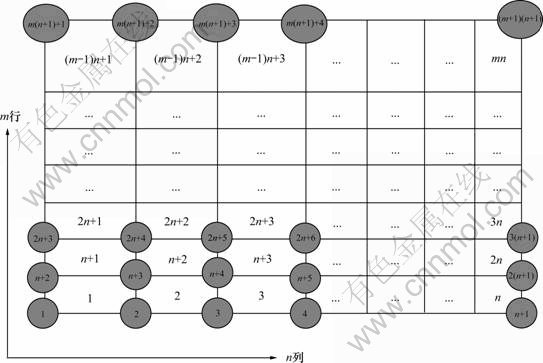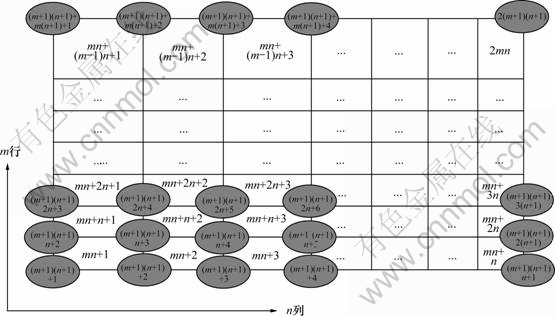取图4中第2幅CT灰度图像的像素矩阵,其单元和节点编号示意图如图7所示,单元、节点编号续接第1幅CT图像像素矩阵最末1个单元、节点编号,所以该图的第1个单元、节点编号分别为mn+1,(m+1)(n+1)+1,其余编号规则与第1幅相同。