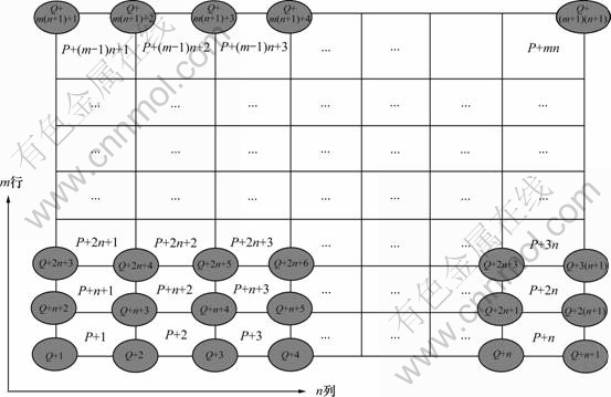 比较第1幅与第2幅示意图的单元、节点编号可知:相邻2幅图片对应位置的单元编号相差mn,节点编号相差(m+1)(n+1),所以对于图4中第k幅图片,其单元和节点编号如图8所示,为方便示意图中标记,记P=(k-1)mn,Q=(k-1)(m+1)(n+1)。