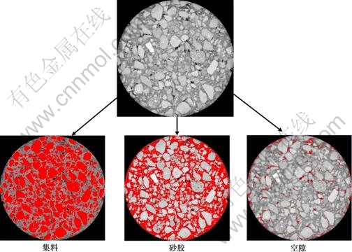 还可以采用物质密度对比的方法进行阀值分割。分别对集料颗粒与配制的沥青砂胶进行CT扫描,获得的图像中确定2种物质的灰阶范围。