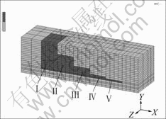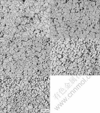 The optical microstructures of as-cast GW103K alloy in the center of different steps are shown in Fig.3 (Ⅰ-Ⅴ). The results indicate that the alloy mainly consists of granular phase of α-Mg and some rare earth-rich phases which randomly distribute along grain boundaries[11]. From step Ⅰ to step Ⅴ, with the cooling rate increase from 1.5 to 18.5 ℃/s[8], the grain size decreases and the dendrite density increases obviously with the reducing of the step height, that is to say, the microstructure is refined with the increase of the cooling rate. The linearly intercepted grain sizes of each step are 71.4, 68.0, 61.2, 42 and 35 ?m, respectively. Furthermore, the grain boundary area is increased; the coarse rare earth-rich phase is refined and its distribution becomes more uniform. Moreover, the original flat grain surfaces become more rough due to the increase of cooling rate.