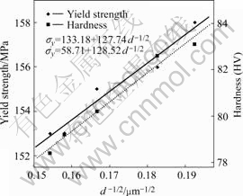 3) The relationships between grain size and yield strength, hardness are both in agreement with the Hall-Petch behavior.