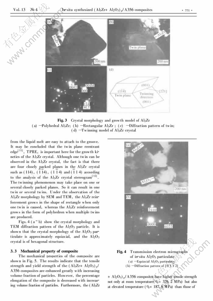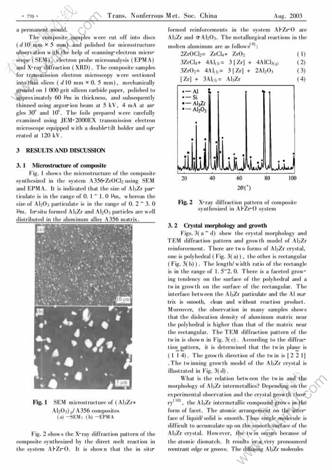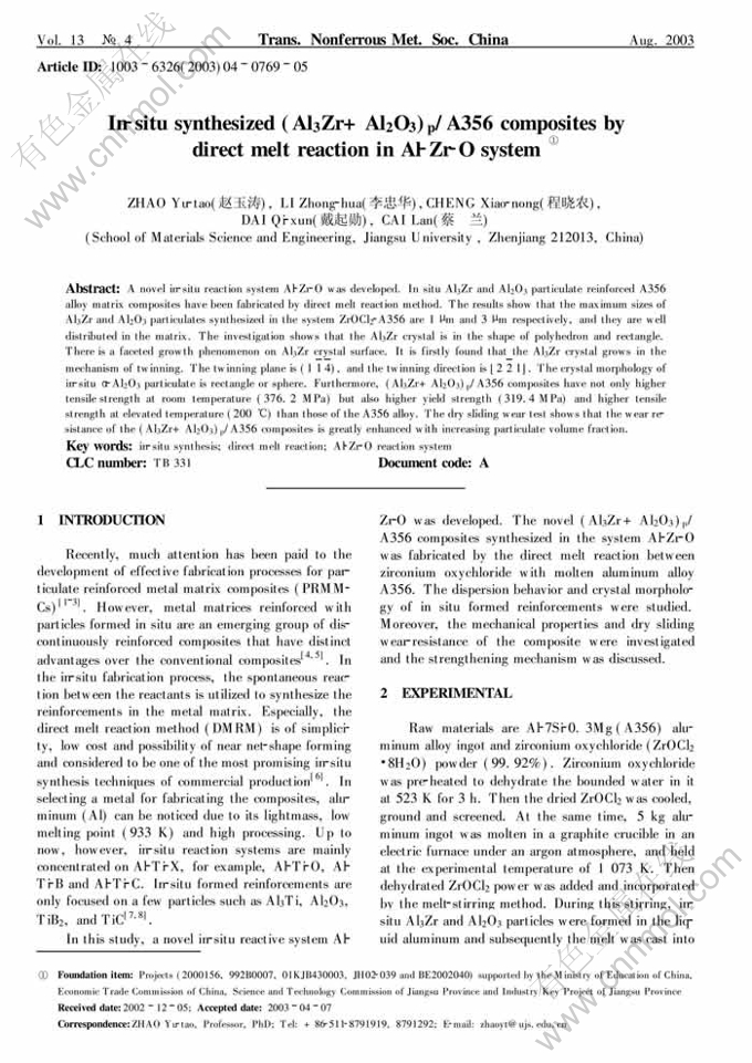 Key words:in-situ synthesis; direct melt reaction; Al-Zr-O reaction system