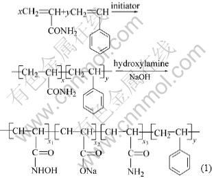 目前,国外用于赤泥沉降过程中的絮凝剂,以氧肟酸类为主。这类絮凝剂是20世纪80年代美国 Cyanamid Companyg[4-7]与Societe National Elfaquitaine[8]最先提出的。氧肟酸类絮凝剂具有沉降后上清液澄清度好,压缩带液固比低等优势,但其沉降速度相对较慢,因此,提高氧肟酸类絮凝剂的沉降速度为目前研究热点。Quadir等[9]提出在高聚物结构中引入水杨酸结构以增大絮凝剂的沉降速度,但因其聚合单体合成工艺复杂、成本高,难于工业应用。本文作者在氧肟酸类物质主链上接入了具有疏水性特性的苯环结构,首次合成了高相对分子质量的带有苯环结构的氧肟酸类高聚物(HHCP),反应式为