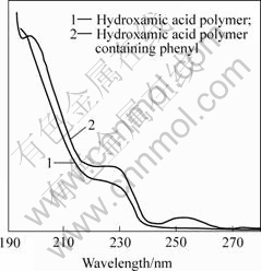 合成产物(苯环含量10%)的紫外谱图如图1所示。在图1中,曲线1与2所示分别氧肟酸类聚合物及带有苯环结构的氧肟酸类聚合物的紫外吸收曲线。与条曲线1相比,曲线2在256 nm左右有一精细吸收带,该吸收带为苯环的特征吸收带,是由π-π* 跃迁与苯环振动的重叠引起的。由紫外谱图可以说明化合物结构中有苯环基团。