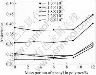 调整反应温度及苯乙烯单体加入量,制备一系列不同相对分子质量不同苯环含量的聚合物,进行沉降实验,30 min 时测量上清液的吸光度,结果如图6所示。