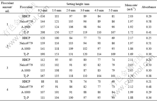 取若干只沉降管,装入250 mm高的稀释矿浆,分别填加各种絮凝剂2 mL,搅拌10次,并记录在0.5、1.0、2.0、3.0、4.0和5.0 min时的压缩带高度(mm)。