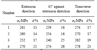 The as-extruded sheet was annealed at different temperatures (300, 350 and 400 ℃) for 1 h. Microstructure was observed by optical microscopy. Mechanical properties of the sheets were tested according to the standard of ASTM. In order to get the anisotropic property of the sheets, the samples for the mechanical property test were cut along the extrusion direction, transverse direction and 45? direction, respectively.