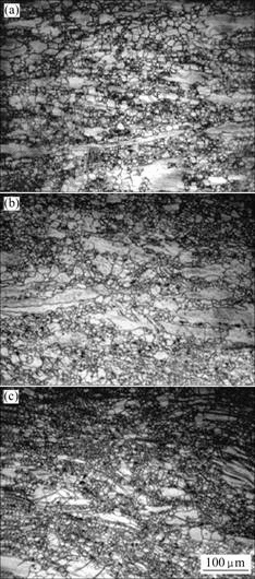 Fig.1 Microstructures of as-extruded AZ31 sheets under extrusion ratio of 13.3 by conventional die: (a) Center of sheet extruded at 380 ℃; (b) Center of sheet extruded at 400 ℃; (c) Edge of sheet extruded at 380 ℃