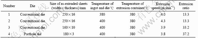 Materials used in the research were commercial AZ31 ingots whose typical compositions were 2.8%-3.2%Al, 0.8%-1.2%Zn, 0.3%Mn, 0.01%Si, 0.01%Cu and Mg balance (in mass fraction). Before being extruded, the AZ31 ingots were milled and homogenized at 400 ℃ for 12 h. The conventional die and the porthole die were used in the experiment to optimize the structure of the extrusion die. The sizes of the ingots used for conventional die and the porthole die were d252 mm×600 mm and d160 mm×400 mm, respectively. The ingots and dies were heated in a box furnace at 380-400 ℃ for 3 h in order to make the temperature uniform. And then, the extrusion was conducted under the parameters listed in Table 1. After extrusion, the as-extruded sheet was cooled to room temperature in air.