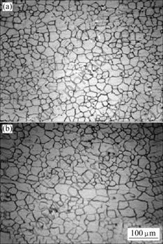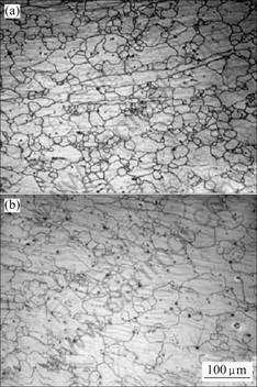 Fig.2 Microstructures of center (a) and edge (b) of as-extruded AZ31 sheets with extrusion ratio of 33.2 at extrusion temperature of 400 ℃ by conventional die