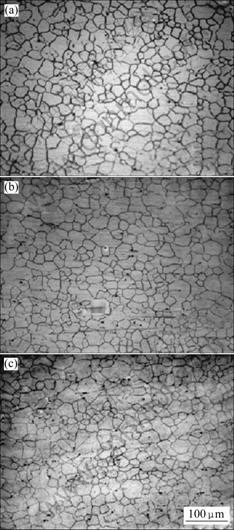 Fig.4 Microstructures of center of as-extruded AZ31 sheets with extrusion ratio of 37.2 at extrusion temperature of 400℃ by porthole die after being annealed at 300 ℃ (a), 350 ℃ (b), and 400 ℃ (c) for 1 h