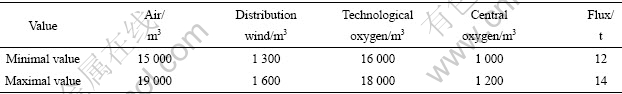 式中 αi(i=1, 2, 3, 4)分别为空气、分配风、工艺氧和中央氧的实际价格的折合比值,单位为元/单位体积;ci(i=1, 2, 3, 4)分别代表空气、分配风、工艺风和中央氧的实际投入体积数,c5对应于熔剂实际投入量,但由于它的量变化较小,所以没有将其纳入能耗函数;