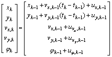 Herein, xk and yk respectively denote the x- and y-coordinate values of the position in the reference coordinate frame at the k-th time interval, vx,k denotes the speed of target in x orientation while vy,k in y direction at the k-th time interval. φk denotes the heading angle at the k-th time interval.