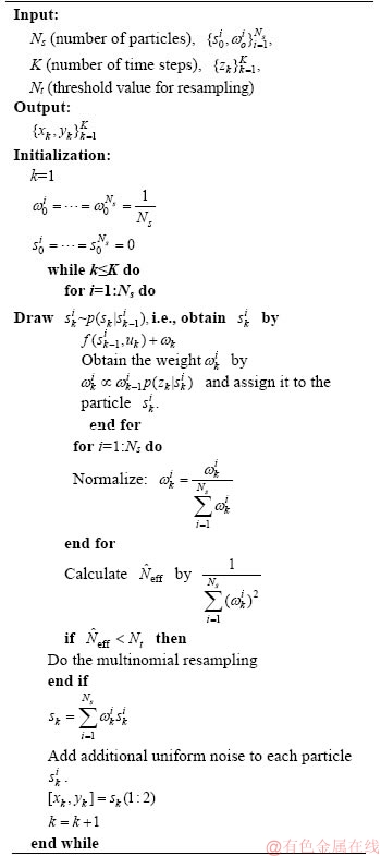 is supposed to represent severe degeneracy. For eliminating degradation as far as possible, we introduce a series of re-sampling methods. Herein, multinomial resampling is substantially applied, meanwhile the particle weights are constricted into (0, 1). Afterwards, resample the particles complying with a standard Gaussian distribution. Through the method, advanced particles with low weights drive away. Then the particles along with high weight are supposed to be re-sampled. After resampling, it is highly desirable that excess noise upon each particle is significantly capable to avoid identical location. Algorithm 2 displays the minutia.