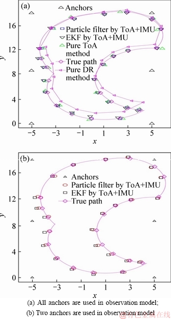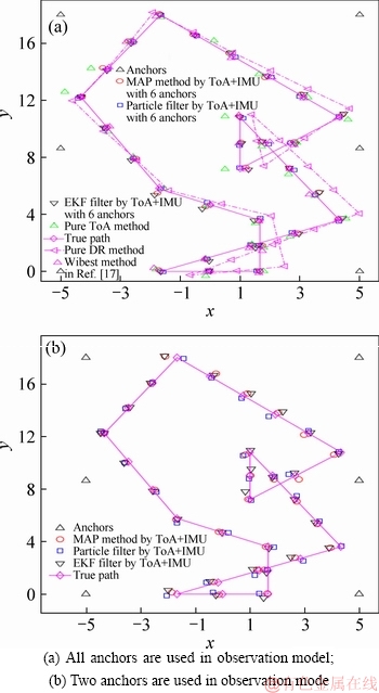 2) If the EKF or PF hybrid method is adopted, there is no need to restrict the motion path or motion characteristics because the acceleration and angular velocity information construct the model for transiting, rather than artificial step estimation. When the requirement that the trajectory between the positions at two consecutive time steps is a straight line is satisfied, similar to the case in Refs. [16, 17], hybrid method with MAP can be applied. And experimental results show that if only two anchors are adopted in observation model, MAP algorithm has the best performance among three kinds of hybrid methods. In the other hand, though the moving path is restricted by the requirement illustrated as above, the characteristics of movement is not restricted for MAP algorithm, that is, different from the work in Refs. [16, 17], the tracking object can move with non-constant speed due to the same reason that while modeling the transition of the process, acceleration and angular rates obtained from IMU are used, not the pedestrian steps.