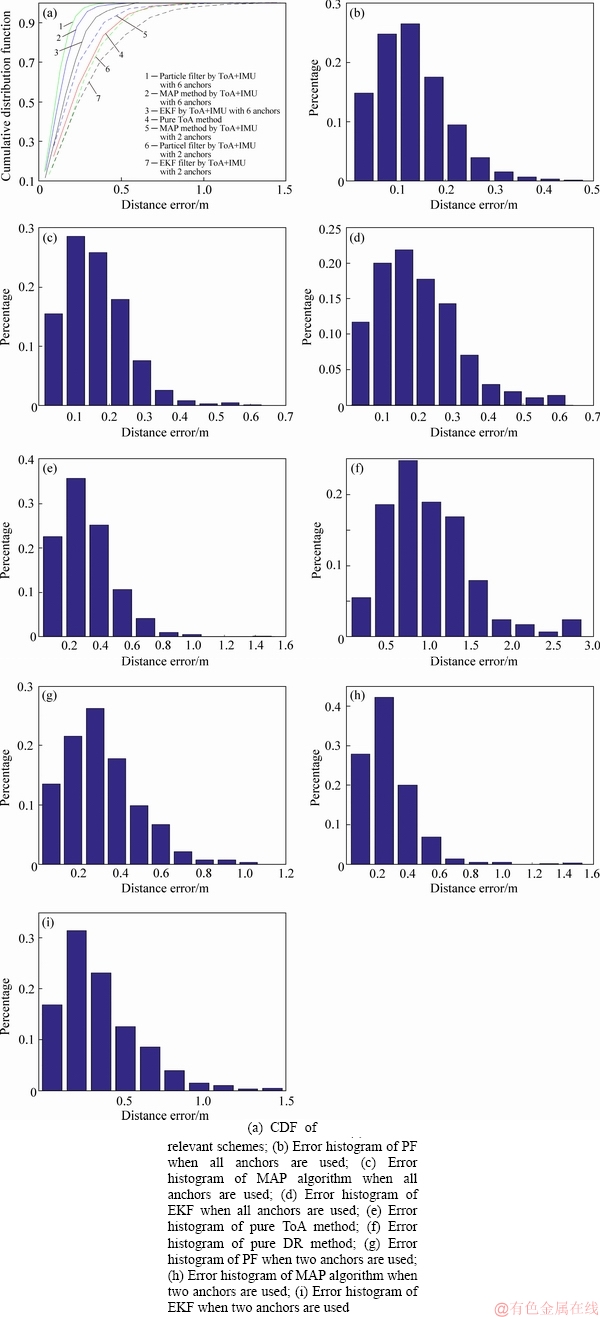 In comparison with EKF, PF and MAP algorithms, we apply cumulative distribution functions (CDF) shown as Figure 5(a) to monitor the distance error patterns of all the relevant schemes except the pure IMU method. We moved along the path 5 times and documented the distance error at each position denoted by magenta diamond marks to smooth the CDF curves. The solid lines present the results of hybrid schemes when 6 anchors are applied and the results of the standalone systems. Obviously, within the hybrid methods, PF algorithm shows the highest positioning accuracy at 90%. However, MAP can hardly match PF, holding the second highest accuracy while EKF performs worst. The broken lines illustrate the results of proposed algorithms while only two anchors are adopted in the measurement model. In this case, MAP algorithm presents the best performance while still EKF has the worst one. Afterwards, the rectangular bars are applied to elucidating the distance error distributions. Figures 5(b), (c), (d) separately show error distributions of PF, MAP and EKF while all the anchors are used. As shown in the figure, PF algorithm has the best performance which is exemplified in the phenomenon that errors can be around in the range of 0.5. Moreover, the PF line attains the peak at the range [0.1, 0.15]m and other two schemes [0, 0.65]m. By EKF, the error is concentrated in the range from 0.05 m to 0.35 m. However, by MAP algorithm, the error is distributed less uniformly though it is concentrated in the range from 0.05 m to 0.35 m as well. For standalone ToA scheme, the error is distributed within the range of 1.6 m while it is concentrated in the range from 0.05 m to 0.45 m as shown in Figure 5(e). For standalone DR method, the error could be quite large, even around 2.75 m. And the error is concentrated around 1 m as depicted in Figure 5(f). Figures 5(g), (h), (i) respectively show the error distributions of PF, MAP and EKF while only two anchors are used. Though for particle filter and MAP method, the errors are both concentrated around 0.2 m, the error of particle filter is distributed more uniformly observed from Figure 5(g). For EKF, there is more probability that distance error is larger than 0.8 m.